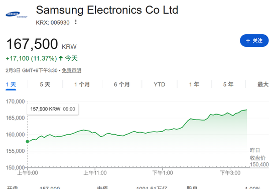 三星电子高涨11%,SK海力士高涨9.28%。
