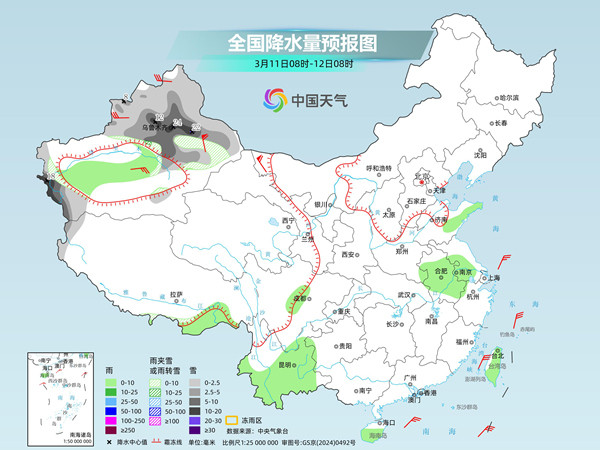 翌日,新疆北疆和南疆西部山区等地部分地区有小到中雪或雨夹雪,其中,新疆沿天平地区和南疆西部山区等地部分地区有大到暴雪,局地大暴雪。新疆南疆盆地、西藏东南部、山东半岛、安徽大部、江苏南部、云南大部、海南岛中南部、台湾岛等地部分地区有小雨。