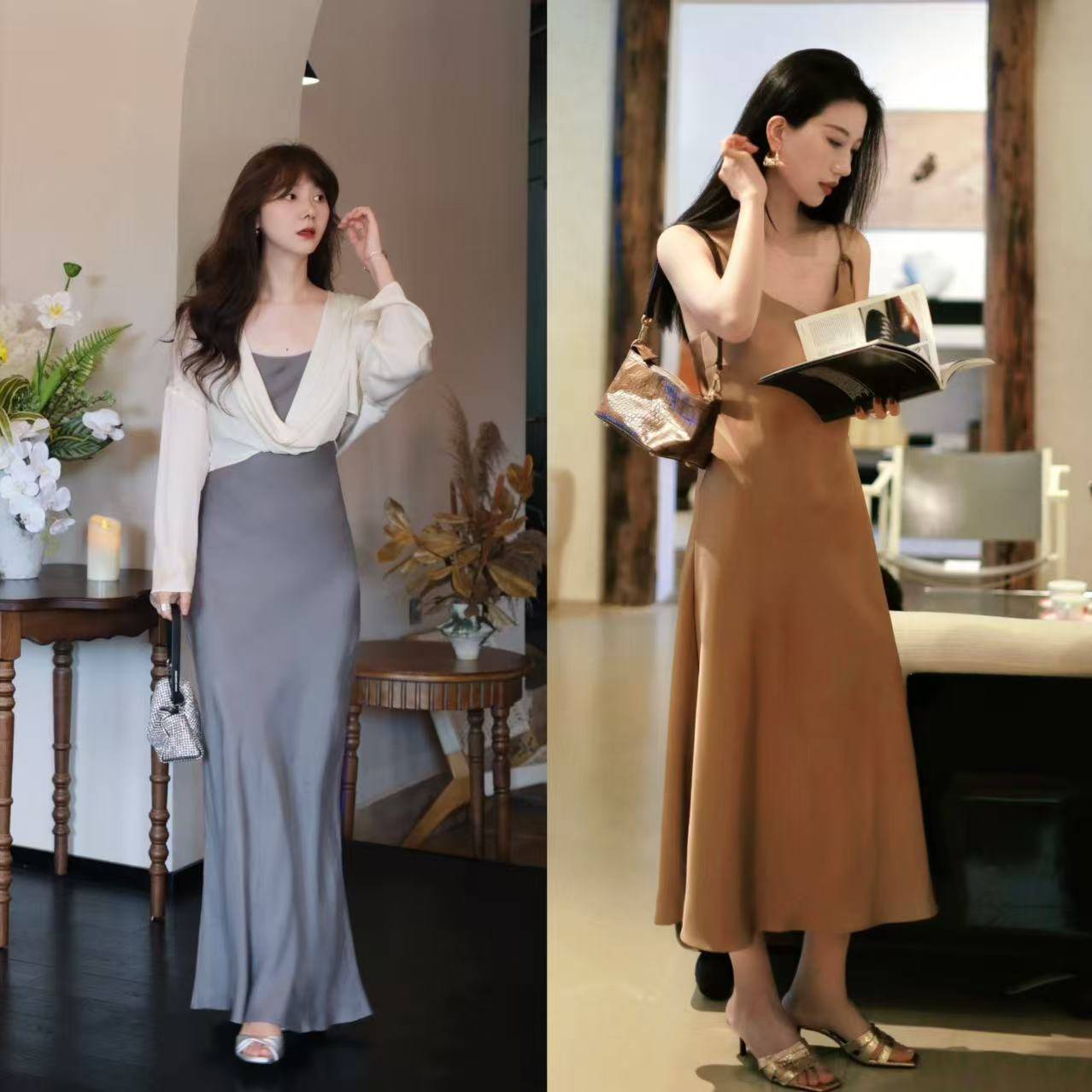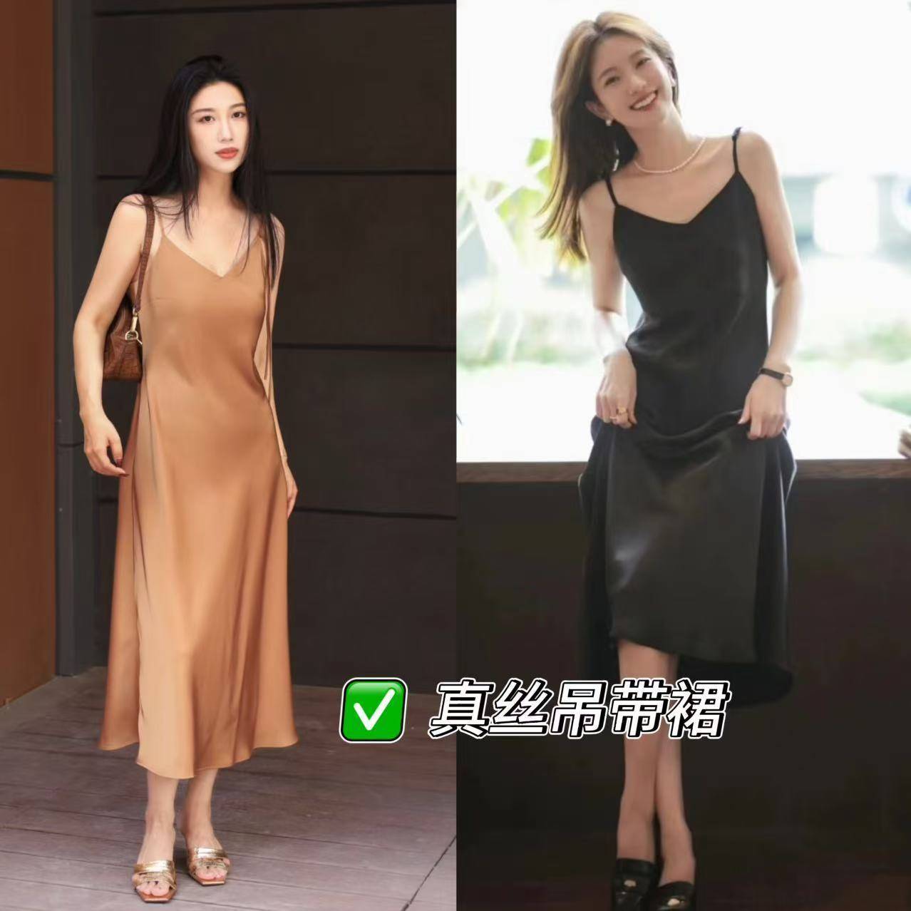 穿搭示范:心爱低调的姐妹可以聘任玄色真丝吊带裙,相等显瘦,个性点聘任彩色吊带裙,比如,前锋博主这套咖金色吊带裙也可以,搭配棕色包包,高等又气质。