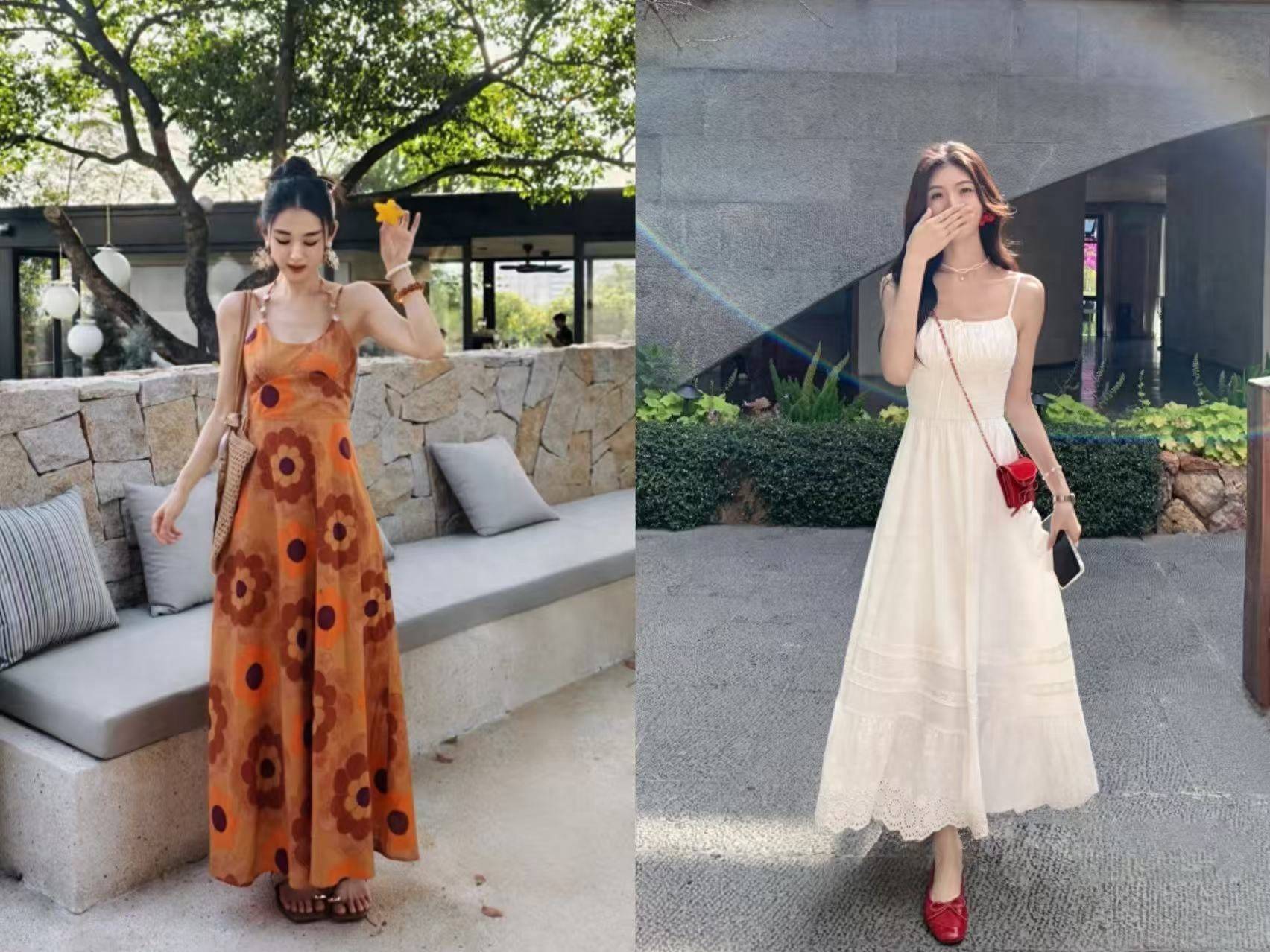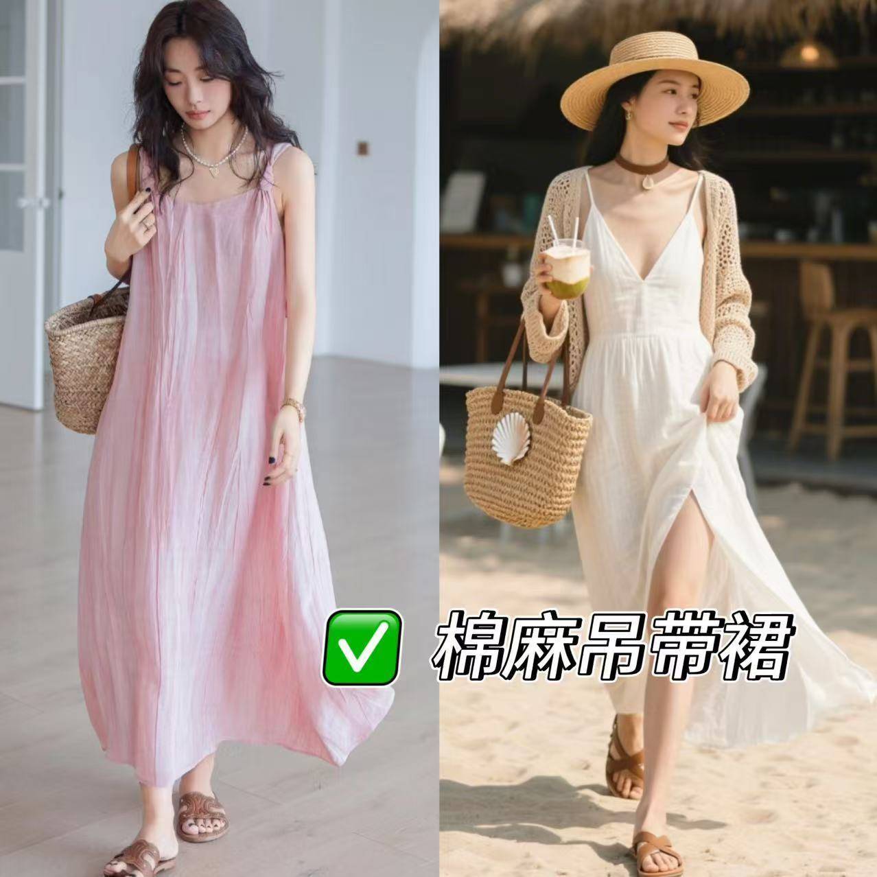 穿搭示范:粉色棉麻吊带裙,宽松的版型慵懒又清闲,充满了仙女感;米白色沙滩款棉麻吊带裙,大V领个高开衩运筹帷幄,露出又显高,照也气质优雅。