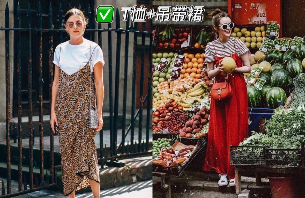 比如:纯白色T恤+豹纹吊带裙,条纹T恤配纯红色吊带裙就很顺眼,展现出线索感和街头感;