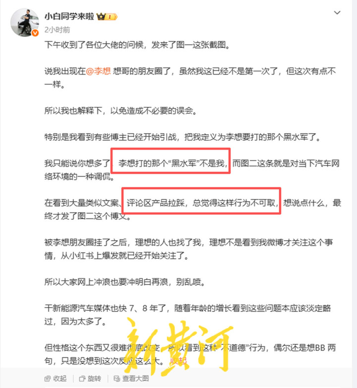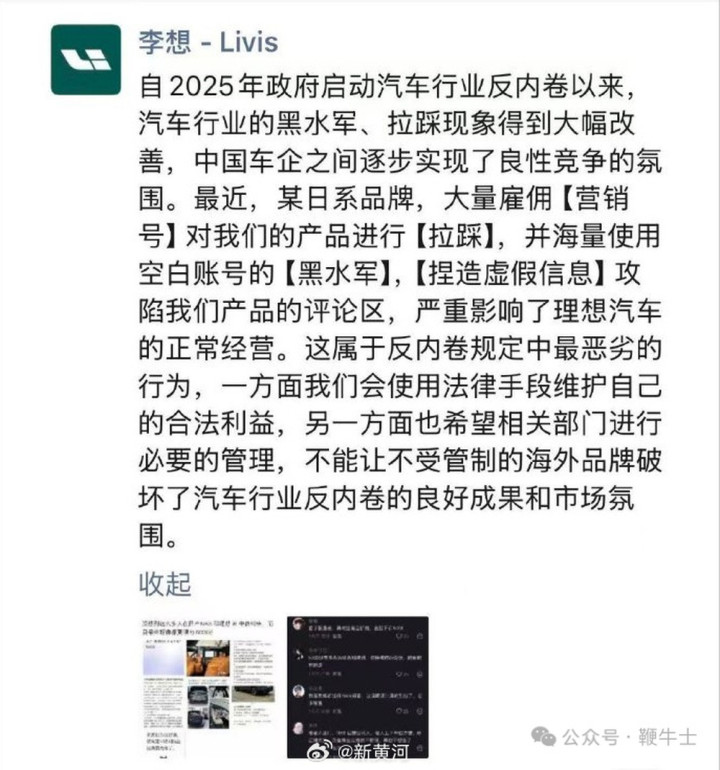 另一条一又友圈的本色是,“最近,某日系品牌,大皆雇佣[营销号]对咱们的居品进行[拉踩],并海量使用空缺账号的[黑水军],[握造乌有信息]攻陷咱们居品的驳斥区,严重影响了理思汽车的平时蓄意”。翰墨下还配了两张截图。