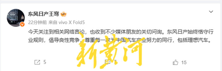 4月11日下昼,东风日产汽车销售有限公司新动力品牌总司理王骞在微博恢复称,幸运彩app官方下载“今天关注到有关集聚言论,也收到不少媒体一又友的存眷问询。东风日产永远坚守行业规章,办法良性竞争,尊重每一家为中国汽车产业发愤的同业,包括理思汽车。”