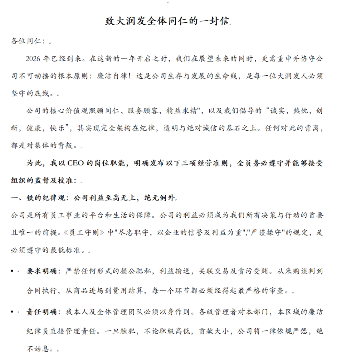 2025年7月,永辉曾发布了致供应商伙伴的一份公开信,高举反腐大旗;而2026运行,李卫平CEO&CMO《致大润发整体同仁的一封信》,重申了大润发不行动摇的根蒂原则:刚直自律,是公司生涯与发展的生命线,是扫数大润发东谈主必须信守的底线。