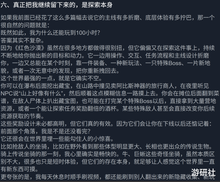 该说法与Steam评论区的一个高赞评测殊途同归,这位游戏时长100小时的玩家写的长评被1554个玩家标志为“有价值”。在列举了多数舛错后,他讲解了为什么还会在游戏中插足100小时,因为“信得过把我留住来的,是探索自身”。