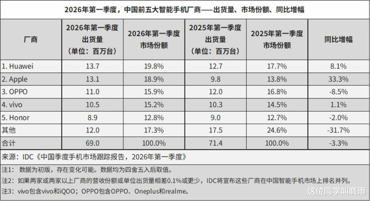 近日,IDC发布2026年第一季度中国手机市集出货量申报。OPPO 以15.9% 的市集份额稳居手机行业前三。