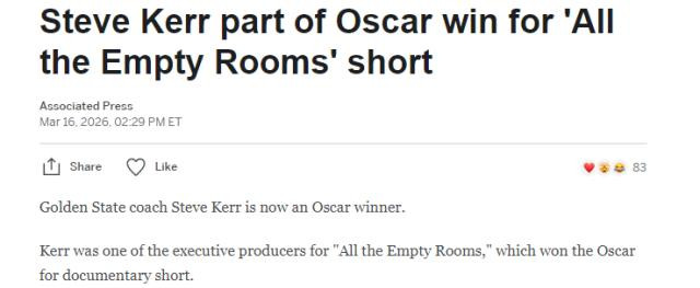 袼褙主帅史蒂夫·科尔又增多了一项垂死荣誉。科尔是记录片短片《静室为证(All the Empty Rooms)》的实验制片东谈主之一,该片荣获第98届奥斯卡最好记录短片奖。科尔也成为继科比、库里和奥尼尔之后第四位赢得奥斯卡奖的NBA东谈主士。