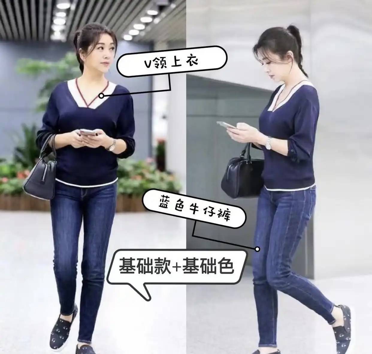 这套蓝色上衣+牛仔裤的搭配,不仅显瘦,配色上也相等高档,领受同色系的搭配,既高档又不挑肤色,黄皮姐妹也能鄙俚垄断。记着全身神采不进步3种,要点放在剪裁和材质上,质感坐窝普及。