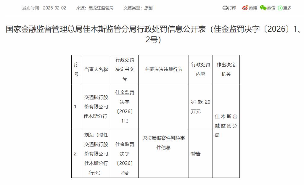 中国经济网北京2月3日讯 国度金融监督处理总局网站昨日公布的佳木斯监管分局行政处罚信息公开表(佳金监罚决字〔2026〕1、2号)显现,交通银行股份有限公司佳木斯分行迟报漏报案件风险事件信息被罚金20万元,刘海(时任交通银行股份有限公司佳木斯分行行长)被警戒。