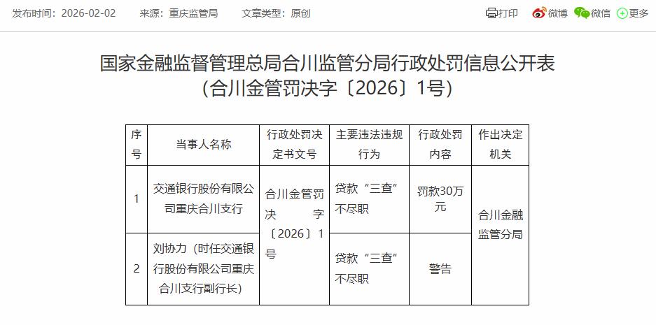 国度金融监督处理总局网站昨日公布的合川监管分局行政处罚信息公开表(合川金管罚决字〔2026〕1号)显现,交通银行股份有限公司重庆合川支行贷款“三查”不遵法。合川金融监管分局对交通银行股份有限公司重庆合川支行罚金30万元,对刘合力(时任交通银行股份有限公司重庆合川支行副行长)警戒。