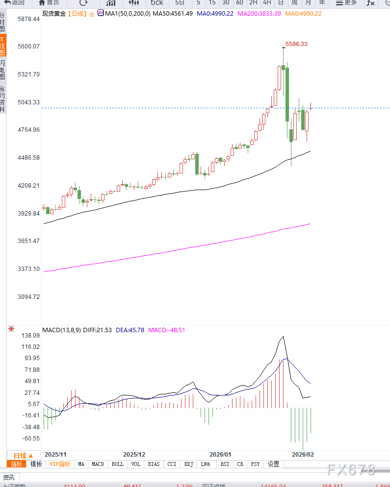 从日线走势来看,金价在此前自历史高位回落后逐步企稳,并展开技术性反弹,目前运行于5000美元上方,显示下方买盘仍具一定承接能力。下方支撑方面,第一支撑位关注5000美元整数关口。