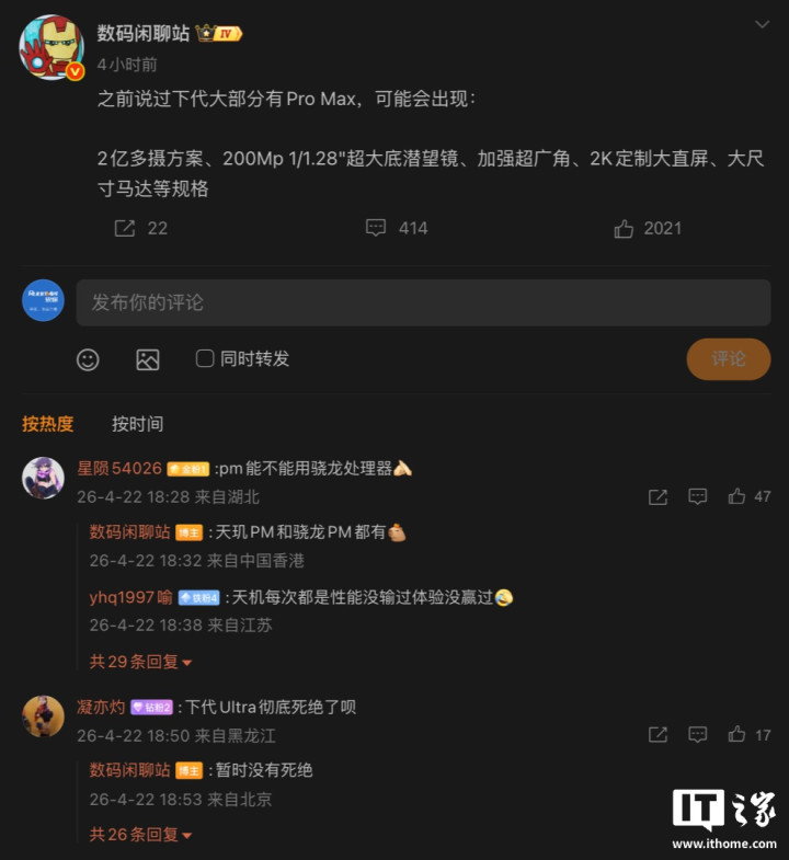 IT之家4月22日音讯,博主@数码闲道站发文,骄气部分品牌依然盘算暂时停更“Ultra”级别旗舰机型,转而发力“ProMax”级别机型,新机可能出现2亿多摄决策、200Mp1/1.28"超大底潜望镜、加强超广角、2K定制大直屏、大尺寸马达等规格。