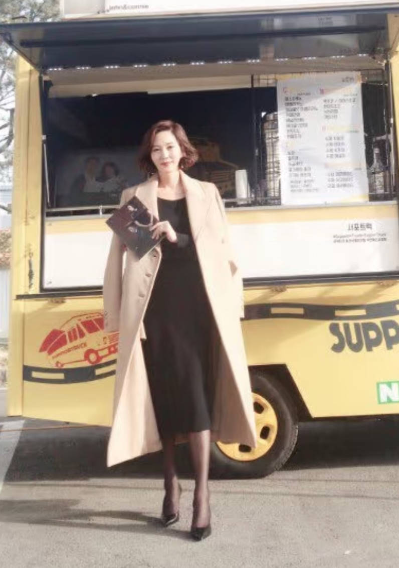 金南珠这套打扮也太高等了吧,经典卡其色风衣动作外衣,内搭玄色长裙,下摆暴露小腿,配上同色系的高跟鞋,大女主的气场藏也藏不住。