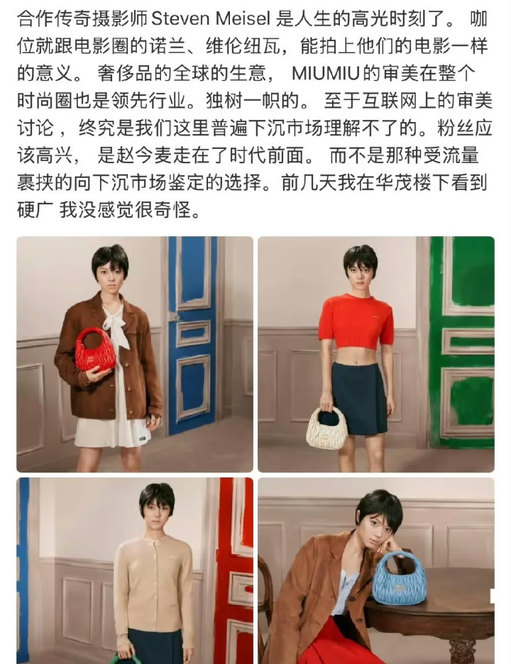 动作miumiu的代言东谈主,赵今麦可以说詈骂常的及格,而况也得到了挺可以的得益,是以也备受品牌方的爱重。今天由她担任拍摄的最新杂志大片出炉,关联词她的造型却还是发了不少网友的吐槽。